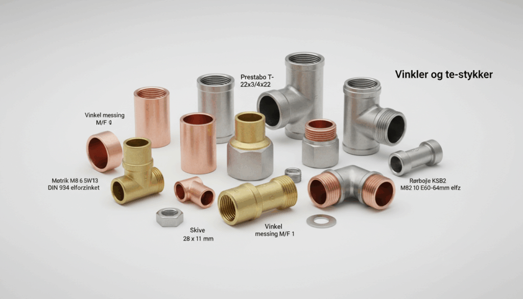Vinkler og te-stykker er VVS-fittings, der gør det muligt at forbinde, ændre retning på og forgrene rør i køkken, bad, varme og vandinstallationer. I denne kategori finder du 90°- og 45°-vinkler, tees (T-stykker) samt specialudgaver som sideudløb, muffe og nippel-tilslutninger. Materialer spænder fra kobber og messing til stål og zink, og både lodde-, klemme- og pressforbindelser giver forskellige installationstyper. Overvej diameter og tilslutningstype, miljøet (udendørs/indendørs) samt korrosionsbestandighed ved valg af fittings. For nybyggeri og renovering er præcision og holdbarhed nøgleord. Billigelogvvs.dk og Globaltools tilbyder et bredt udvalg af vinkler og te-stykker.